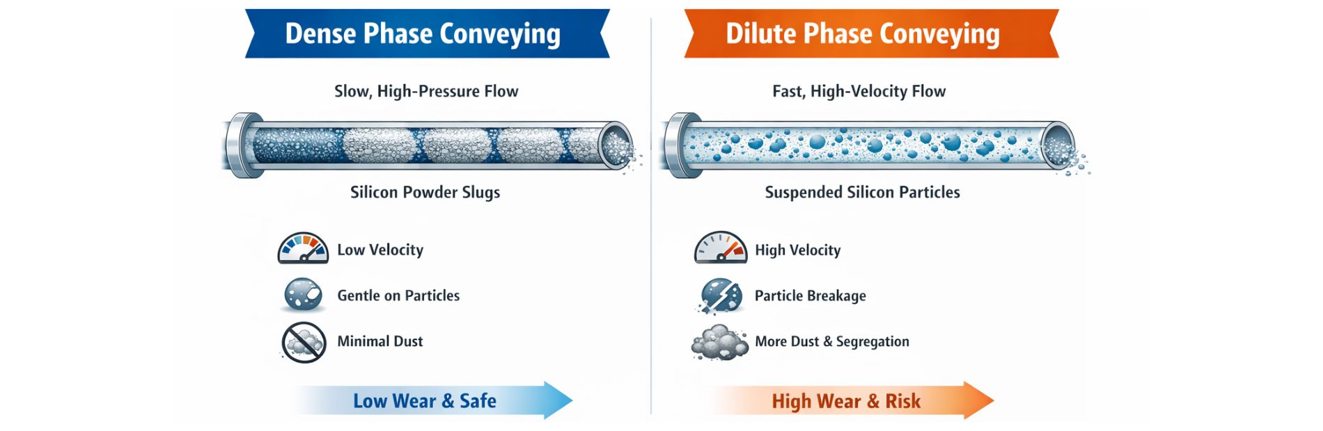 Silicon powder is extremely fine, fragile, and sensitive to mechanical stress. Choosing the right conveying method is critical to protect material quality and ensure safe handling. The table below explains why dense phase pneumatic conveying is better suited than conventional dilute phase systems for battery-grade silicon powder.