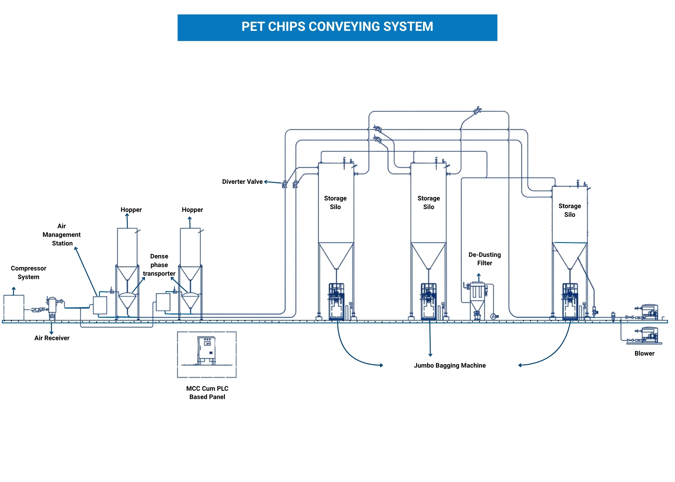 - Dense Phase Conveying Systems (6 TPH Each): Dense phase pressure conveying systems were installed to transfer PET chips from the feed hopper to storage silos. The low-velocity dense phase operation minimizes attrition and fines while ensuring energy-efficient, reliable, and flexible material transfer.