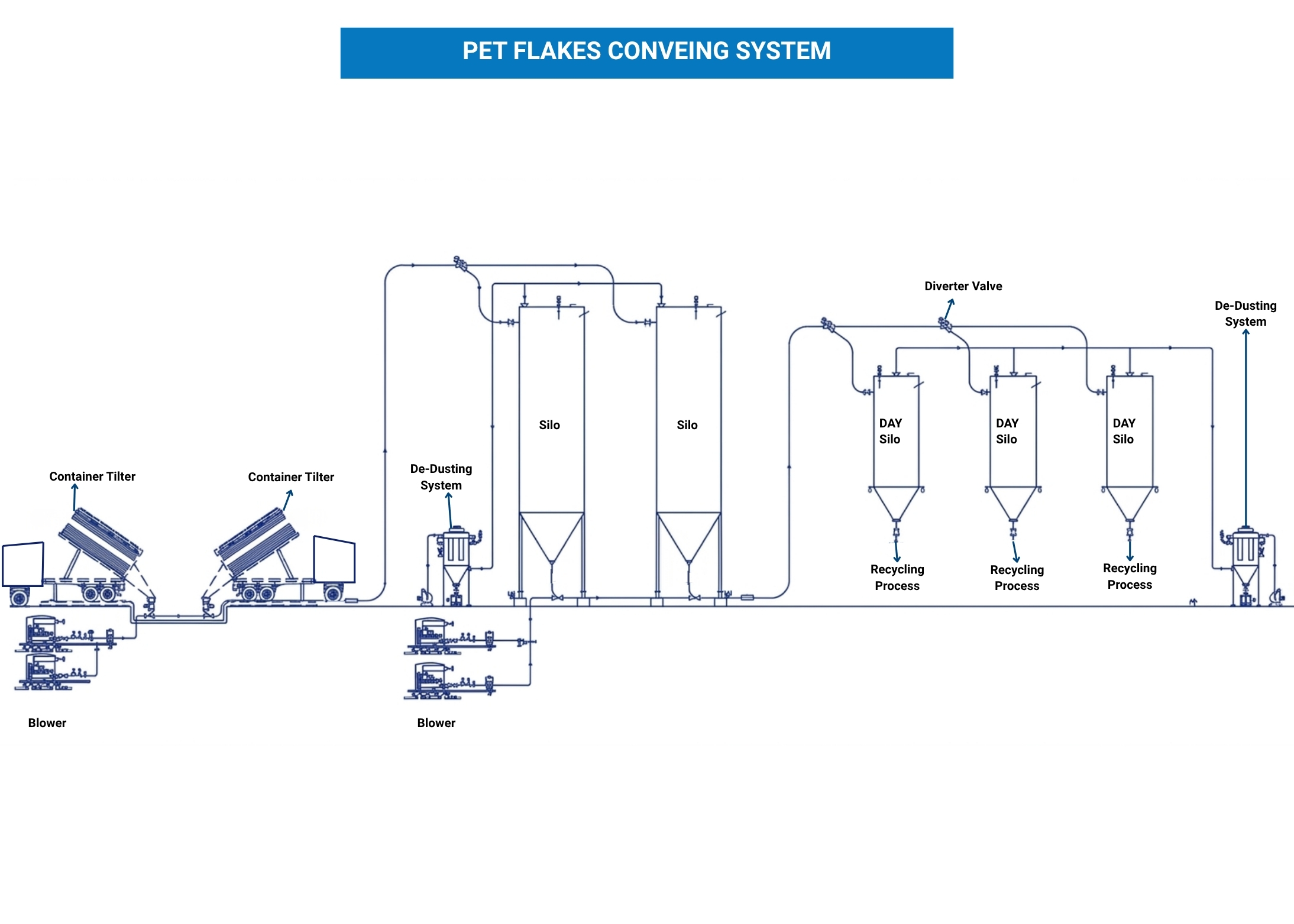 - 12 TPH Conveying from Storage Silos to Day Silos: • Another dilute phase conveying system, rated at 12 TPH, transfers PET flakes from the main silos to downstream day silos. This system also includes a standby blower, ensuring uninterrupted supply to production.