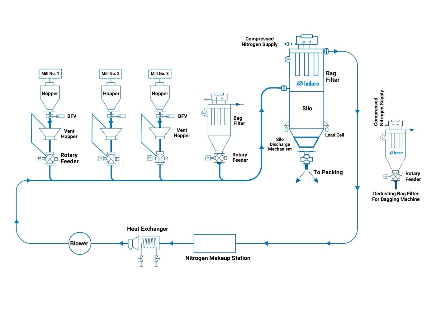 Indpro’s closed-loop nitrogen conveying and storage systems are engineered to deliver safe, efficient, and contamination-free bulk material handling solutions for agrochemical powders. These systems are specifically designed to address the challenges associated with handling sensitive, dusty, and explosion-prone materials like Mancozeb, while ensuring product integrity and operational safety. With fully sealed conveying lines, nitrogen inerting, and dust-free operation, the solution supports stringent quality, safety, and environmental requirements. Overall, Indpro’s technology enhances process reliability, maintains material purity, improves plant hygiene, and increases production efficiency for agrochemical manufacturing applications.
